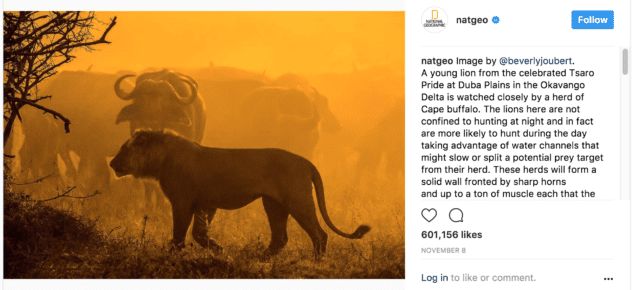 National Geographic not only get likes and shares, but also keeps followers engaged. Each photo posted has something to offer to the viewer. It might be an intro to an interesting story, or a brief tutorial on how an awesome picture was taken.